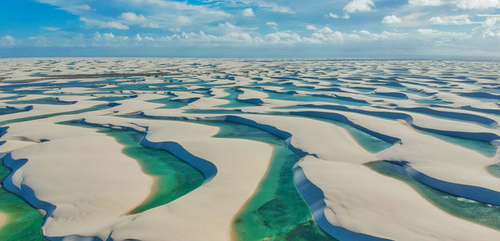 Au nord du Brésil, une région étonnante offre l’un des paysages les plus singuliers du continent : le désert de dunes et de lagunes du Parc national des Lençóis Maranhenses. Sur plus de 155 000 hectares, d’immenses dunes de sable blanc pouvant atteindre 40 mètres de hauteur s’étendent à perte de vue, ponctuées de lagunes d’eau douce aux teintes allant du turquoise au vert émeraude.